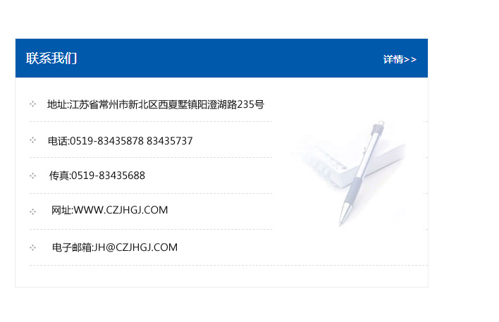 地址:常州市新北區友邦商務大廈1幢16、17層  電話:0519-85101652  傳真:0519-85112595  郵編:213022  網址:www_cz-jiayue_cn.fstkjx.com  郵箱:xiajifengaa@163.com